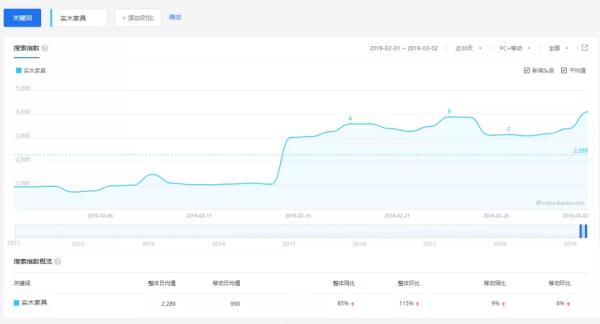 數(shù)據(jù)顯示,多數(shù)消費(fèi)者更喜愛(ài)實(shí)木家具。2018年,新浪聯(lián)合居然之家及13家行業(yè)協(xié)會(huì)共同發(fā)布的《2018新中產(chǎn)家居消費(fèi)指數(shù)報(bào)告》中顯示,72%的消費(fèi)者喜愛(ài)實(shí)木材質(zhì),其中一部分更偏愛(ài)高檔紅木。從百度指數(shù)來(lái)看,近30天內(nèi)“實(shí)木家具”的日均搜索量在兩千左右。春節(jié)后每日搜索量甚至達(dá)到三千。